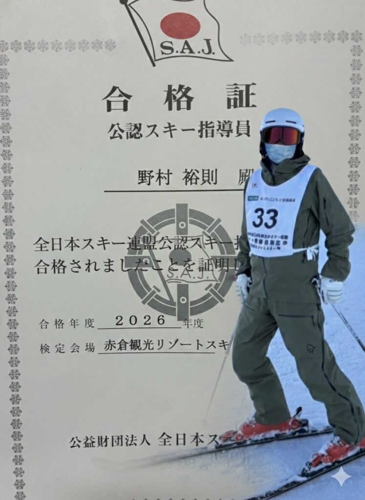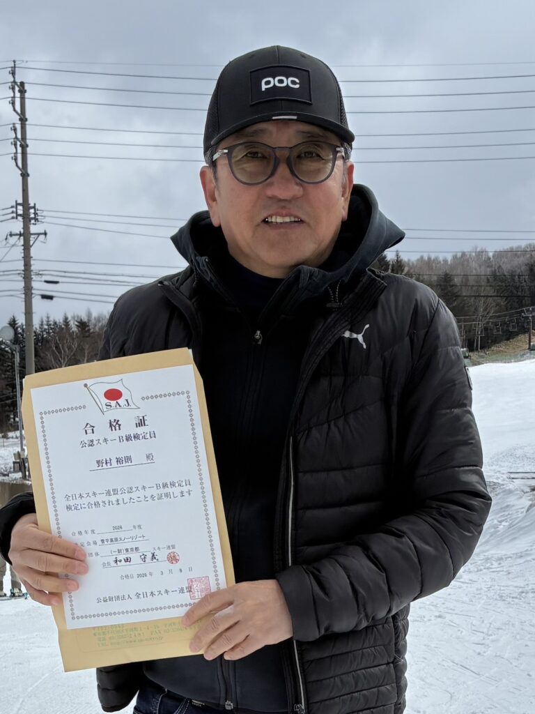 このたび、渋谷区スキー連盟所属の野村裕則さんが、SAJ公認の正指導員およびB級検定員の資格試験に見事合格されました。